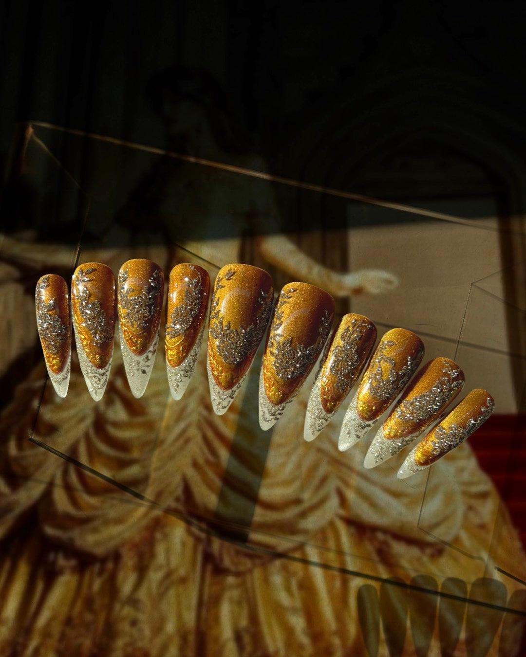 Ballroom Gown – Intricate Lace over Layered Gold Nails