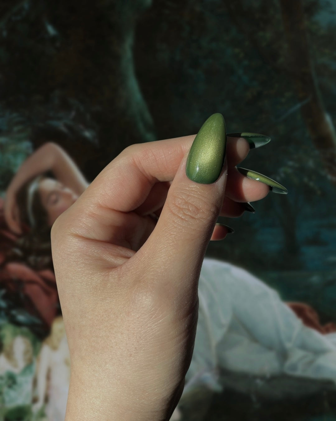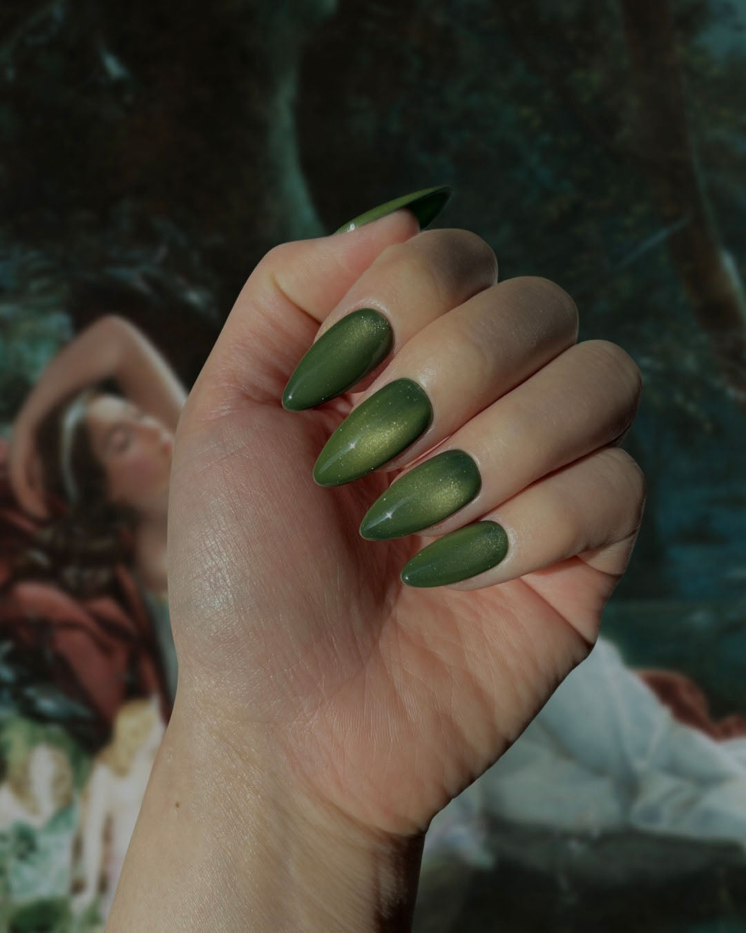 Hippolyta – Amazonian Green and Olivine Flash Cat Eye Nails