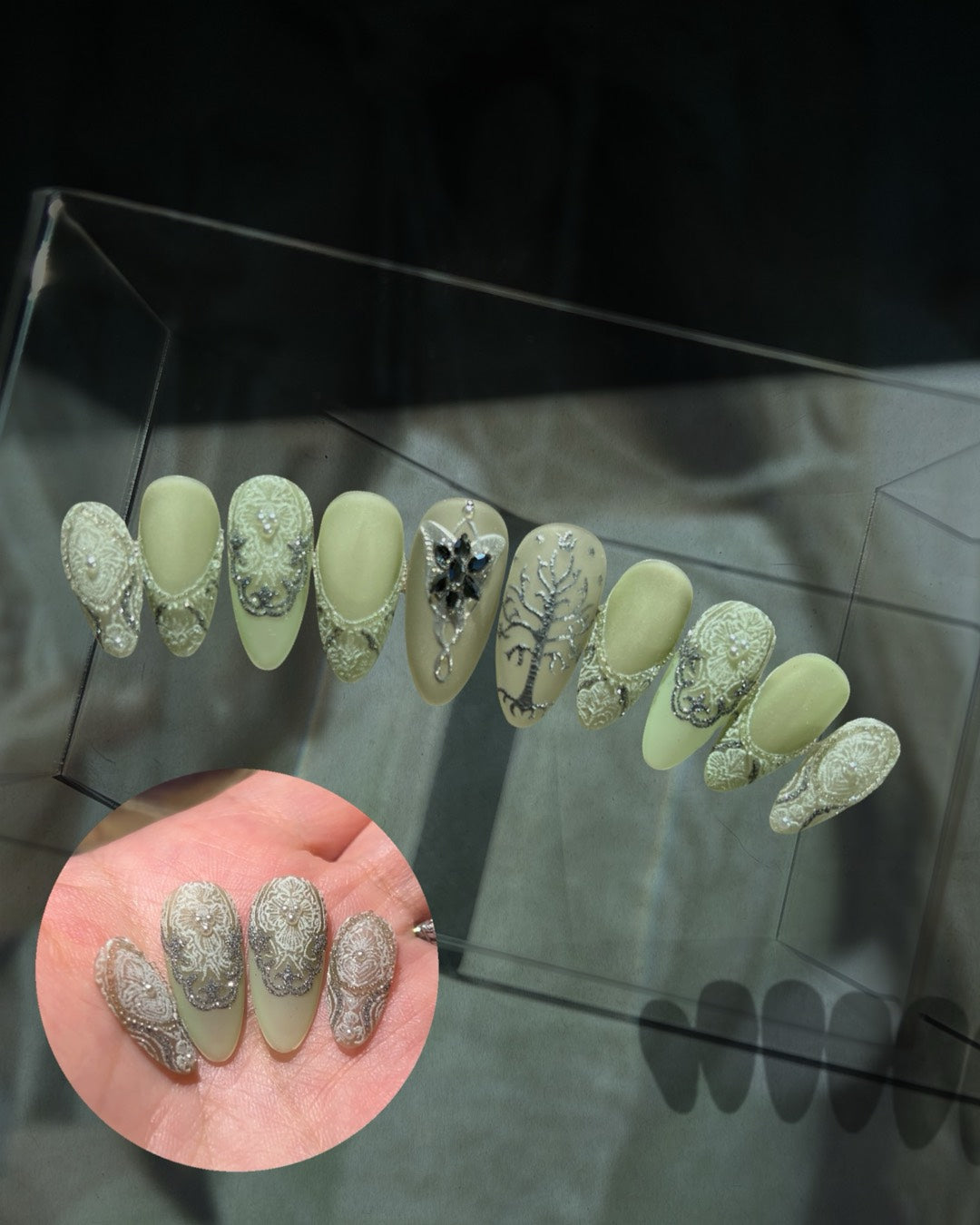 Ethereal Coronation – Pastel Sage Lace with Reflective Silver Details Nails